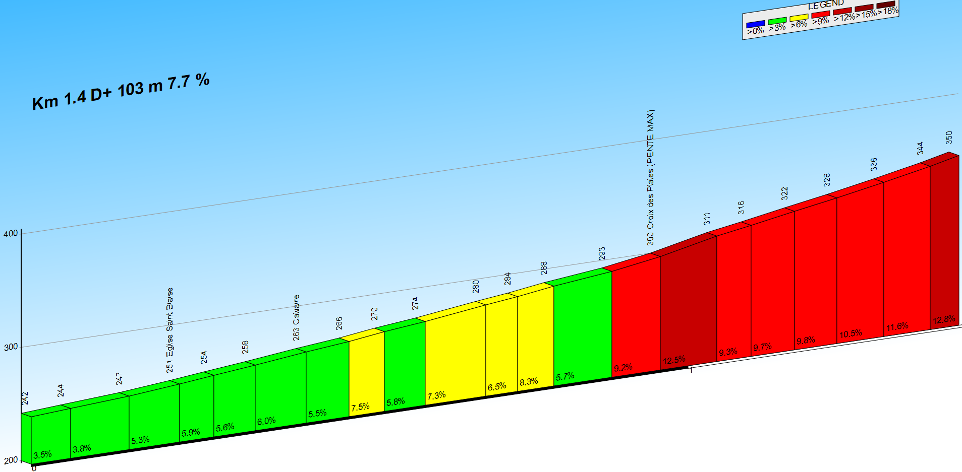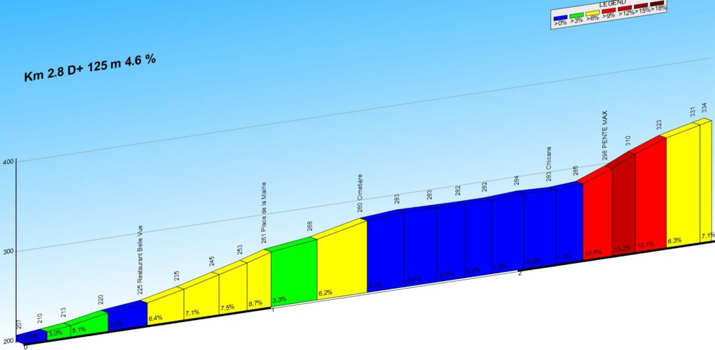 La deuxième étape (27,4 km et 658 m de dénivelé) est du genre « casse-patte » et comporte 3 segments. Une longue grimpée régulière (Firstplan), une courte bosse très pentue (Neuland) suivie d’une brève ascension apparemment anodine qui se termine en raidar à 13 % (Voegtlingshoffen).