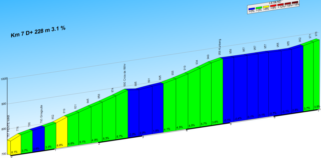 Description : Segment irrégulier avec plusieurs faux plats montant et descendant. La première partie jusqu’à la Croix de Wihr comporte de courts passages à plus de 6 %. Ensuite les pentes dépassent rarement les 5 %. Tout le segment est tracé en milieu forestier.