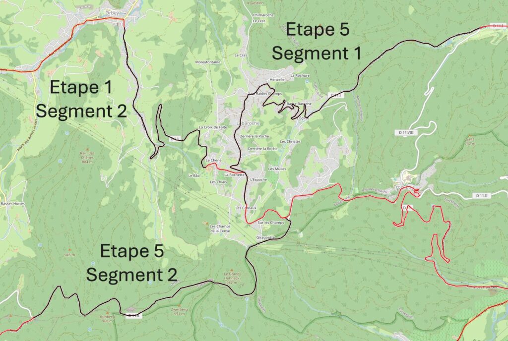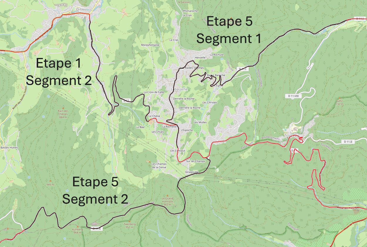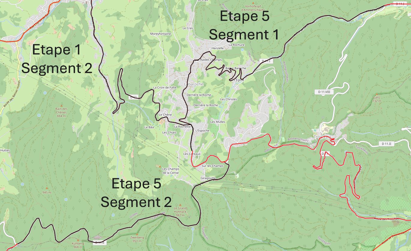 La cinquième étape (17,3 km et 720 m de dénivelé) propose 2 longs segments de difficulté inégale : la rude grimpée de Labaroche par le vallon du Walbach et la montée en escalier au Collet du Linge par la Croix de Wihr.