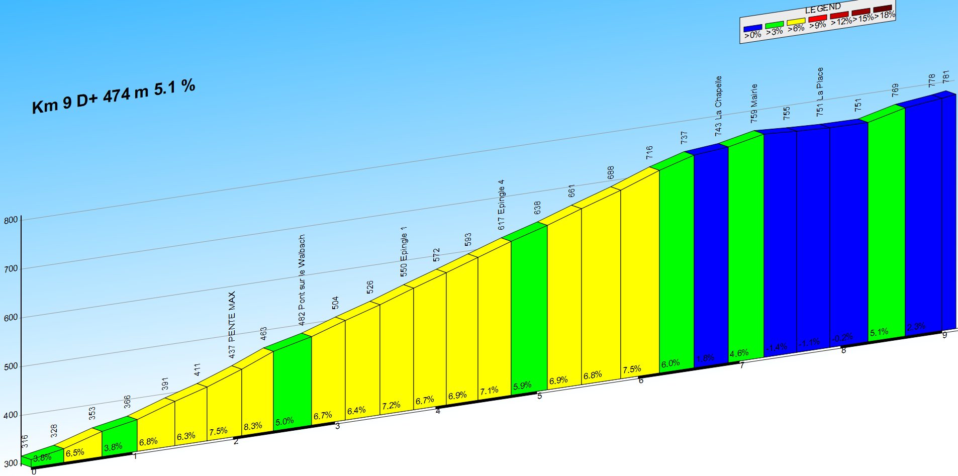 Description: La première partie du segment, la plus difficile, grimpe le long du Walbach jusqu’à Basse Baroche et serpente ensuite (8 épingles) à travers les lieux dits de Labaroche pour atteindre la mairie. Reste alors 2 km moins exigeant, avec une légère descente vers La Place suivi de la remontée vers les Coreaux.